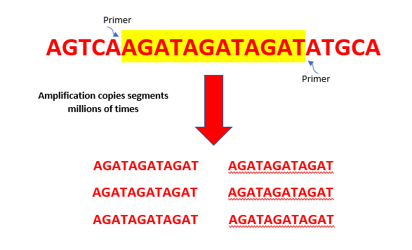 Next, the enzyme zeroes in on the sentence, or DNA sequence. We use primers (short DNA sequences that match the words or segments of interest) to locate the start and end of the words or segments of STRs. These STRs are then amplified and copied millions of times in many cycles so that they can be detected and visualized for analysis. The more cycles the DNA goes through, the more copies that are made, which increases the chances of getting an optimal DNA profile even from trace amounts of DNA.