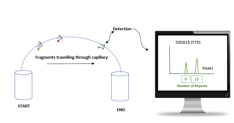 Once the STRs have been amplified, we can measure and identify the DNA “sentences” in the sample. Detection of the STRs and their repeats occur through capillary electrophoresis (CE). With CE, the STRs are separated by size (i.e. the length of the repeat), starting on one side of a thin tube, known as a capillary, and travelling through to the other side. Based on their size, the fragments can move slowly (for larger fragments) or quickly (for smaller fragments), dragged forward by the attractive pull of a positive charge to the negatively charged fragments. The fragments pass through a detector that reads the color-tag found on the primer and assigns a color to each locus fragment. After all fragments have passed through the capillary, data is sent to the computer, producing “peaks” that the analyst uses to generate a DNA profile. (Fig 5) Different fragments of similar size will produce similar peaks; these fragments are assigned a different color tag so that analysts can differentiate between the different loci. Fragments that are different sizes can be assigned the same color tag because it is easier to tell them apart.