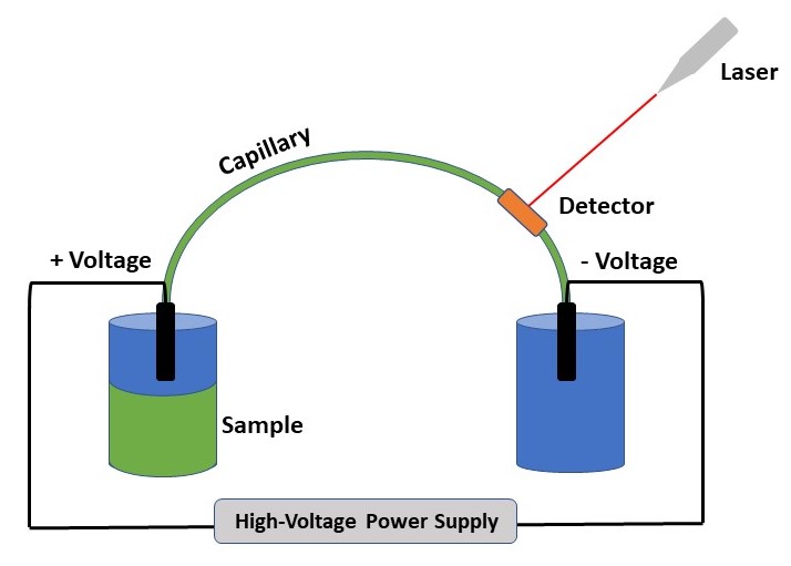 The researchers investigated these impurities using using capillary electrophoresis (CE) for separation with indirect ultraviolet (UV) detection to potentially yield a more objective identification (Figure 2). Unlike direct UV detection, where the laser excites the analyte of interest and a detector monitors the resulting light emission, indirect UV detection causes an interactions between analytes of interest with ions in solution. This interaction is what produces the detected light emission, and how the compounds are identified. CE with indirect UV detection allows for quick separation (< 10 minutes) of the components by applying specific solvents and voltages to a thin glass tube.