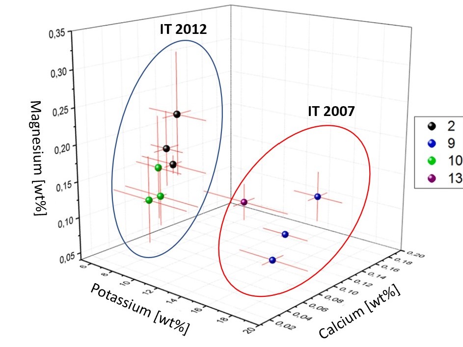 However, when the authors investigated three analytes simultaneously (magnesium, potassium, and calcium) using PCA, the Italian-made (IT) samples from 2007 (9 and 13) and 2012 (2 and 10) could be clearly identified as distinct and grouped separately (Figure 5).