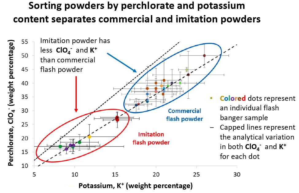 The next steps included grouping the chemical signatures (signal intensities from UV) and comparing them, illustrated by Figures 3, 4, and 5. Samples from different locations were identified and categorized into the Cobra 6 imitation set or commercial sets by comparing different analytes at the same time. This is achieved by using principal components analysis (PCA), a statistical method that groups samples based on their similarities. Essentially, the authors tested the composition of a sample by the weight percentage of perchlorates (ClO4-), magnesium, potassium (K+), and calcium (Ca2+) and compared them against others. For Figures 3 and 4, two analytes (K+ and ClO4-) and (Ca2+ and K+) were investigated to achieve some distinction between flash banger samples. Despite the limited sample size, the researchers could determine a difference between the imitation powders and the Cobra 6 powders. Conversely, there was difficulty in classifying the commercial flash bangers, Cobra 6 and Cobra 2G.