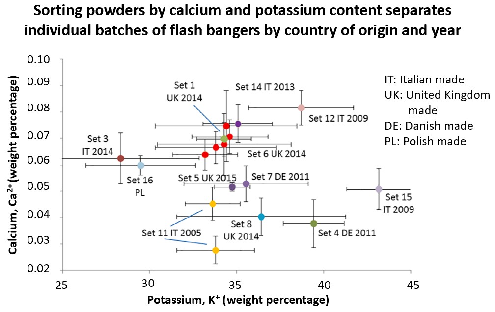 Currently, forensic analysts focus on features of pre- or post-explosive devices. A team led by Dr. Adrian van Asten from the University of Amsterdam chose to push the boundaries of identification and explore possible chemical trends of the powders. The main compounds under investigation are inorganic (meaning non-carbon based or metal containing) mixtures such as ammonium nitrate and potassium perchlorates, as well as certain metals. These are commonly found in “factory-made” fireworks. However, if fireworks are made in clandestine or illegal areas, they can possess impurities consistent with that area. This allows investigators to potentially localize the area of production. With those impurities, scientists can generate databases like the University of Central Florida’s smokeless powder or ignitable liquids database, sharing information obtained in an academic setting for investigative use.