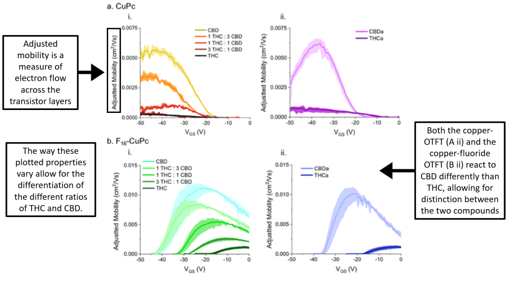 The researchers outfitted the OTFT device with a thin film of FBBB on top of two different kinds of semiconducting layers, one copper based (CuPc) and the other fluorinated copper (F16-CuPc). Then they assessed the performance of the device under ambient conditions to reflect those for which cannabinoid samples would likely be tested. This device distinguished between FBBB and FBBB-cannabinoid complexes from their different conductivities (Figure 2Aii and 2Bii); the FBBB had a larger current and voltage than the cannabinoid-FBBB complexes. The research team then prepared solutions of THC and CBD in 1:3, 1:1 and 3:1 ratios to assess if the device could predict the ratio of THC and CBD (Figure 2Ai and 2Bi).