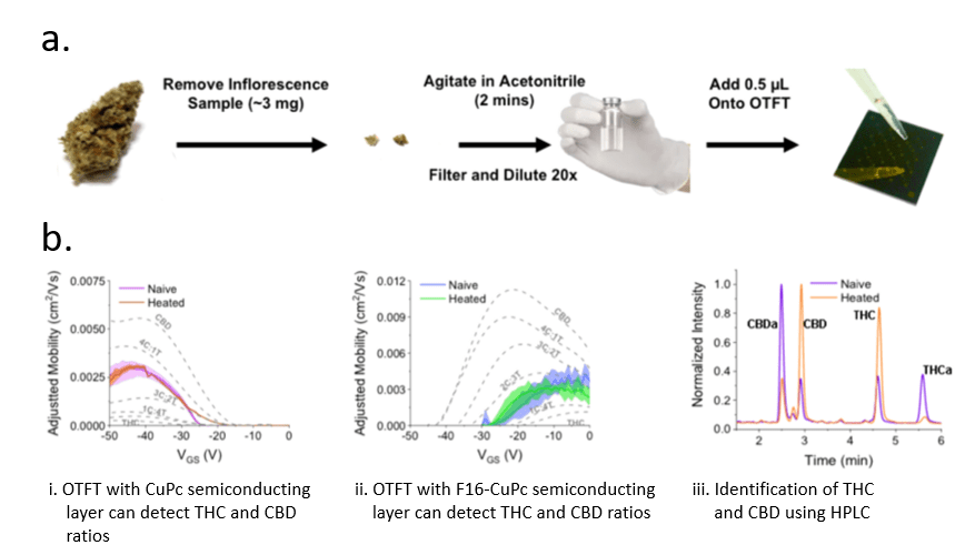 Dr. Adam Shuhendler from the University of Ottawa created FBBB-sensitized OTFTs to rapidly sense various cannabinoids, particularly CBD and THC, pre and post-pyrolysis (burning). In addition, they assessed if their device could also detect THC and CBD vapors, as detecting these vapors in a vehicle is of interest to law enforcement.