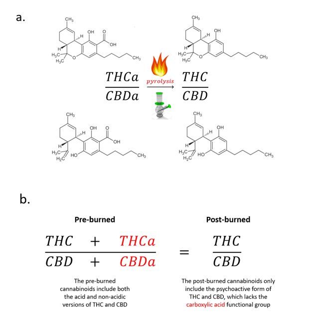 Pre-burnt THC and CBD samples, however, are in their non-psychoactive carboxylic acid form prior to being burned. While THC and CBD are chemically different from their carboxylic acid form, the device could not distinguish between the non-psychoactive and psychoactive form, detecting THCa as THC and CBDa as CBD while still differentiating THC from CBD (Figure 3). Thus, the ratio of THC and THCa to CBD and CBDa prior to pyrolysis could be used to predict the ratio of THC to CBD post-pyrolysis (Figure 3A).