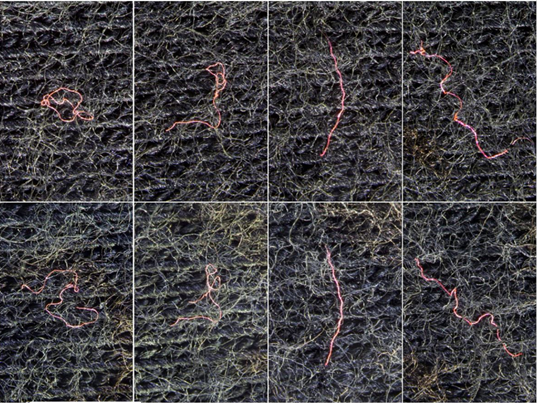 The scientists rubbed together a polyester pink hoodie and a black cotton t-shirt to transfer the pink fibers (Fig. 2) and then left the t-shirt outside, somewhere on the forested terrain of Zurich, Switzerland. They also put a pink-fiber-covered t-shirt indoors to see if they could replicate their outside studies using a “weather machine” with electric tower fans, vertical sprinklers and tilted floors (to simulate mountain inclines). Comparing the controlled laboratory setting to the true outdoors would not only reveal quantifiable information on fiber persistence, but also determine if other scientists could simulate weather impacts to forensic evidence indoors.