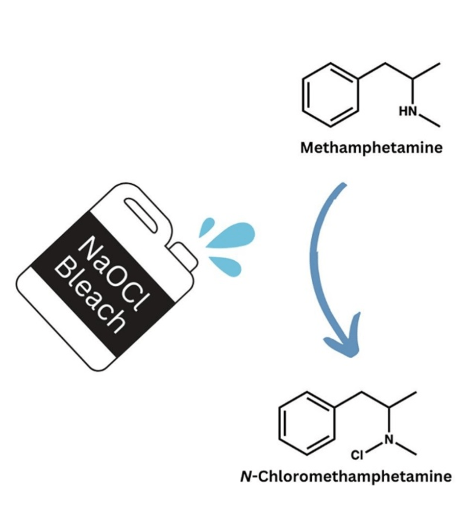 While many of us may immediately reach for bleach to spotlessly cleanse a dirty environment, in the case of clandestine drug labs, this is discouraged by the US Environmental Protection Agency (EPA) for various reasons. Most notably, the US EPA acknowledges the lack of information on potential new products formed between methamphetamine, all the chemicals used to make meth, and commercial cleaning products. To begin coloring in this black box, Prof Gordon Miskelly and Ph.D. student Alexandra Mayer at the University of Auckland published a recent study about the various products and reaction rates between methamphetamine and sodium hypochlorite bleach using classical chemistry methods (Fig 1).