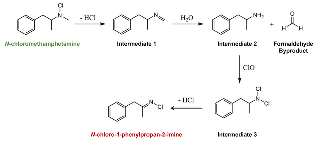 In the mechanism, N-chloromethamphetamine, formed in the basic environment of the bleach, loses a chlorine atom. The chlorine atom doesn’t like to exist by itself, and partners with the free hydrogen atoms in the bleach solution to form HCl. This step forms the first intermediate, which then reacts with water in the bleach solution to form a second intermediate and release formaldehyde gas. The second intermediate reacts with the chlorite ion which is dominant in bleach (a part of sodium hypochlorite) to form a third intermediate, which then releases another chlorine ion as HCl to form the stable N-chloro-1phenylpropan-2-imine, seen in their NMR and GC-MS results.