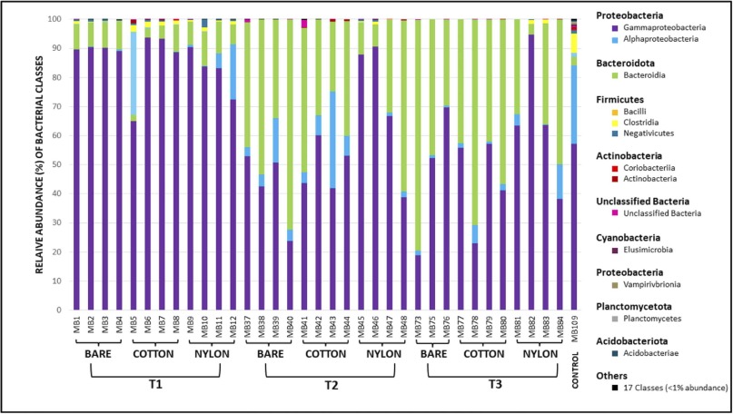 After completing the experiment, the researchers found that the bacterial diversity within the tanks changed over time and temperature. DNA sequencing revealed that the phylum Proteobacteria dominated the water samples of all piglets in the first trial (T1) and showed remarkably little change over time. In contrast, the bacterial population shows a greater presence of Bacteroidota bacteria for the second and third trials, with different patterns; the nylon and cotton clothed bodies showed minimal population shifts during the 4-week sampling period, while the Bacteroidota population of the unclothed body increased over time (Figure 1). The scientists connected these observations to temperature, as the T1 samples were collected during higher average daily temperatures (13.5°C or 56.3°F) than T2 and T3 (~10°C and 12°C respectively). This led the researchers to believe that Proteobacteria prefer warmer environments. Therefore, the type and abundance of bacteria present in the water samples is dependent on the climate conditions.