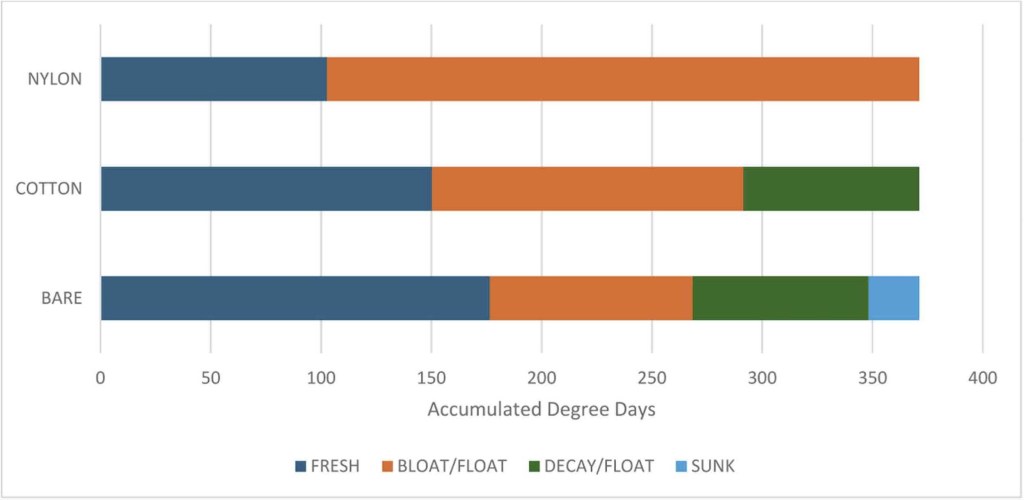 Finally, over the 365 accumulated degree days (ADD), which accounts for the time and water temperature between trials, the scientists observed different effects of body decomposition based upon the clothing type. These included bloating, sinking, and floating. Nylon-clothed piglets bloated faster than the bare and cotton-wearing piglets, but never fully entered the decay stage. The researchers theorized that the nylon material created a preservation layer between the body and the water due to its hydrophobic properties, like wrapping something in plastic film. They also explained the faster bloating as a result of the nylon concentrating the heat inside the body due to limited breathability of the fabric, though this result could change with different weaves of the material. The bare piglets, on the other hand, exhibited the shorter bloating/floating phase and reached the decay stage the fastest, eventually sinking. Similar to the bare piglets, the cotton-wearing piglets also reached the decay stage, but like the nylon-wearing piglets, never sank.