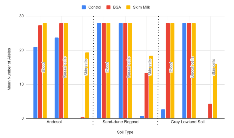 STR analysis confirmed that the number of alleles detected in the skim milk and BSA samples increased significantly as opposed to the control (Figure 3). The more alleles that are detected, the more DNA is being successfully recovered and the easier it is to identify individuals using STR analysis. This is particularly true for skin cells, which resulted in little to no alleles for the untreated soil sample and a notable increase with the addition of skim milk. All alleles present in the DNA from the blood and buccal cells were almost always completely recovered in both the BSA and skim milk samples.