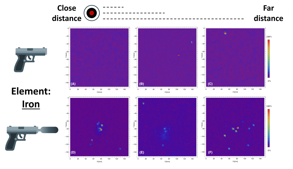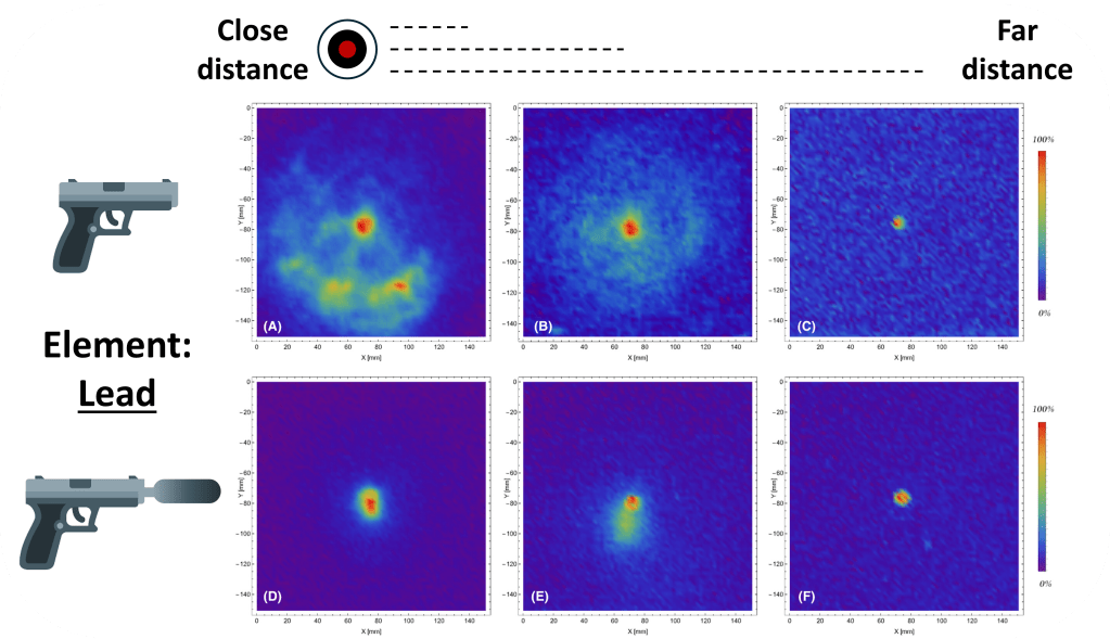 The scientists created a homemade silencer (Fig 1) attached to the end of a pistol. They first analyzed how the silencer changed the spread of GSR onto a target using X-ray fluorescence. This technique shoots X-ray beams at powder samples and determines the metal content based on the changes in irradiation. Lead, for example, produces specific changes that make its profile unique and easy to identify. The researchers plotted the lead distribution of the GSR from a suppressed and non-suppressed pistol, visualizing the distinct reduction in lead particle distribution as the distance between the shooter and the target increased (Fig 2). This indicates that when the bullet hole is large enough to suggest close fire, the distribution of lead can be used by crime scene investigators to determine if a silencer was used during the crime.
