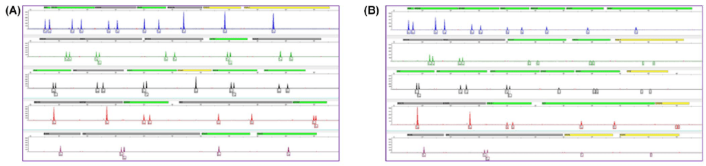 The scientists in the Applied Genetics Group at NIST, who completed the study, produced degraded female and male DNA extracted from blood using UV light, which disrupts and mutates the bonding between our DNA strands. The non-degraded sample produced sharp, high intensity peaks for all 20 gene markers analyzed (Fig. 2A); in comparison, the degraded sample had less intense peaks for the longer genetic markers, with some disappearing entirely (mainly the last three genetic markers in black; Fig. 2B). However, both samples produced consistent profiles with consistent DNA quantity over the period of a year, demonstrating their long-term stability when properly stored in a fridge.