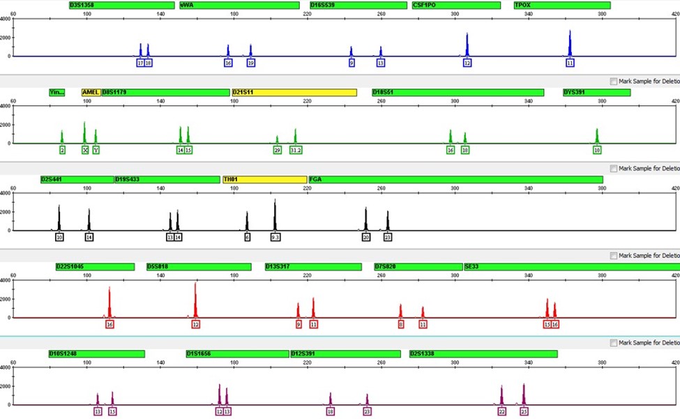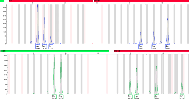In addition to degraded DNA, RGTM 10235 also includes three complex mixtures samples – one of male and female DNA in equal parts, and two samples of two male and one female DNA at different ratios. Interpretation of DNA mixtures relies on the proper amplification of each contributor or donor, and the ratio between the peaks to denote the donor as major or minor. Since each donor can only contribute at most two peaks per genetic marker, the presence of more than two peaks strongly indicates multiple donors (Fig 3). If two donors have completely different peaks per genetic marker, it is entirely possible to identify both profiles at all DNA markers – and some genetic markers have upwards of twenty different peak possibilities! Identifying all profiles in a mixture can be especially important for crimes involving multiple perpetrators, such as in the cases of sexual assault or murder.